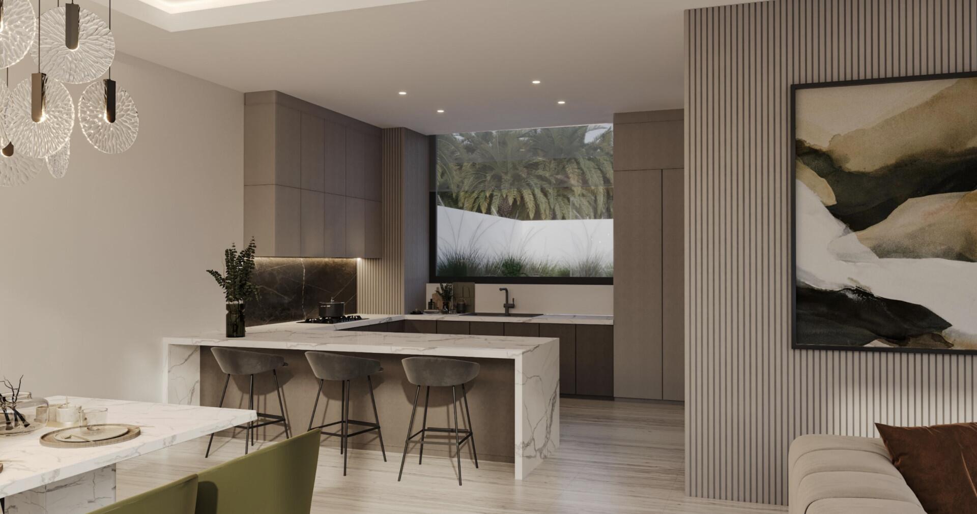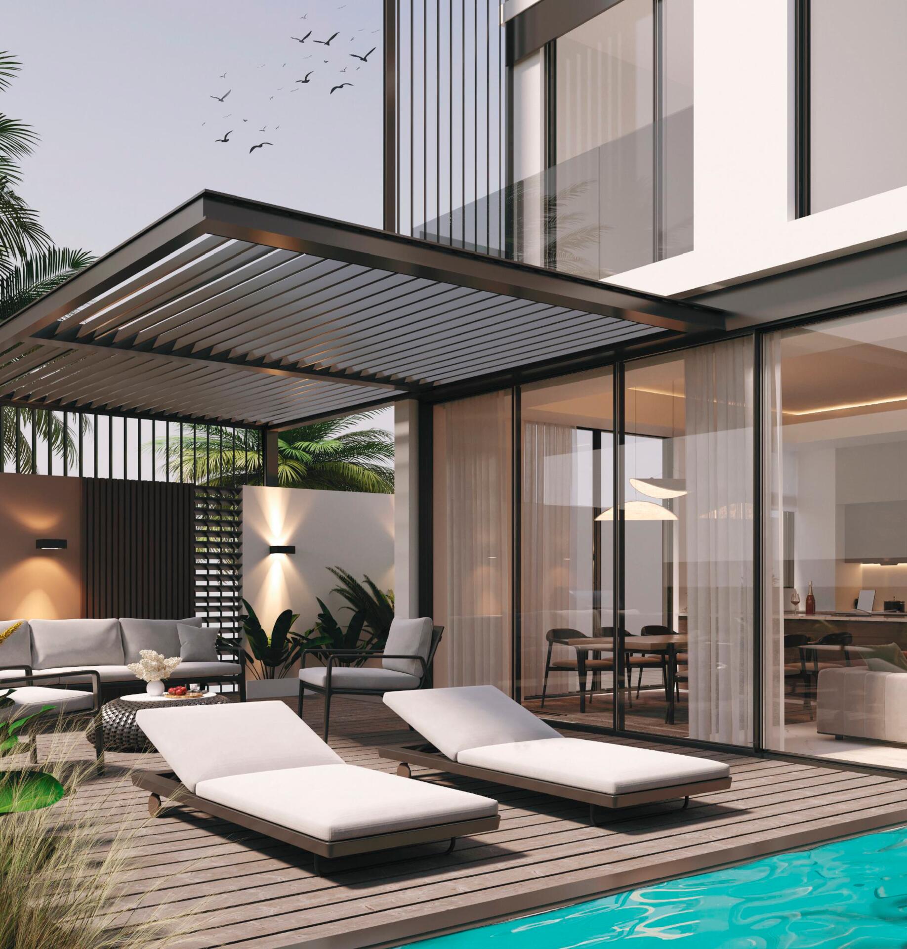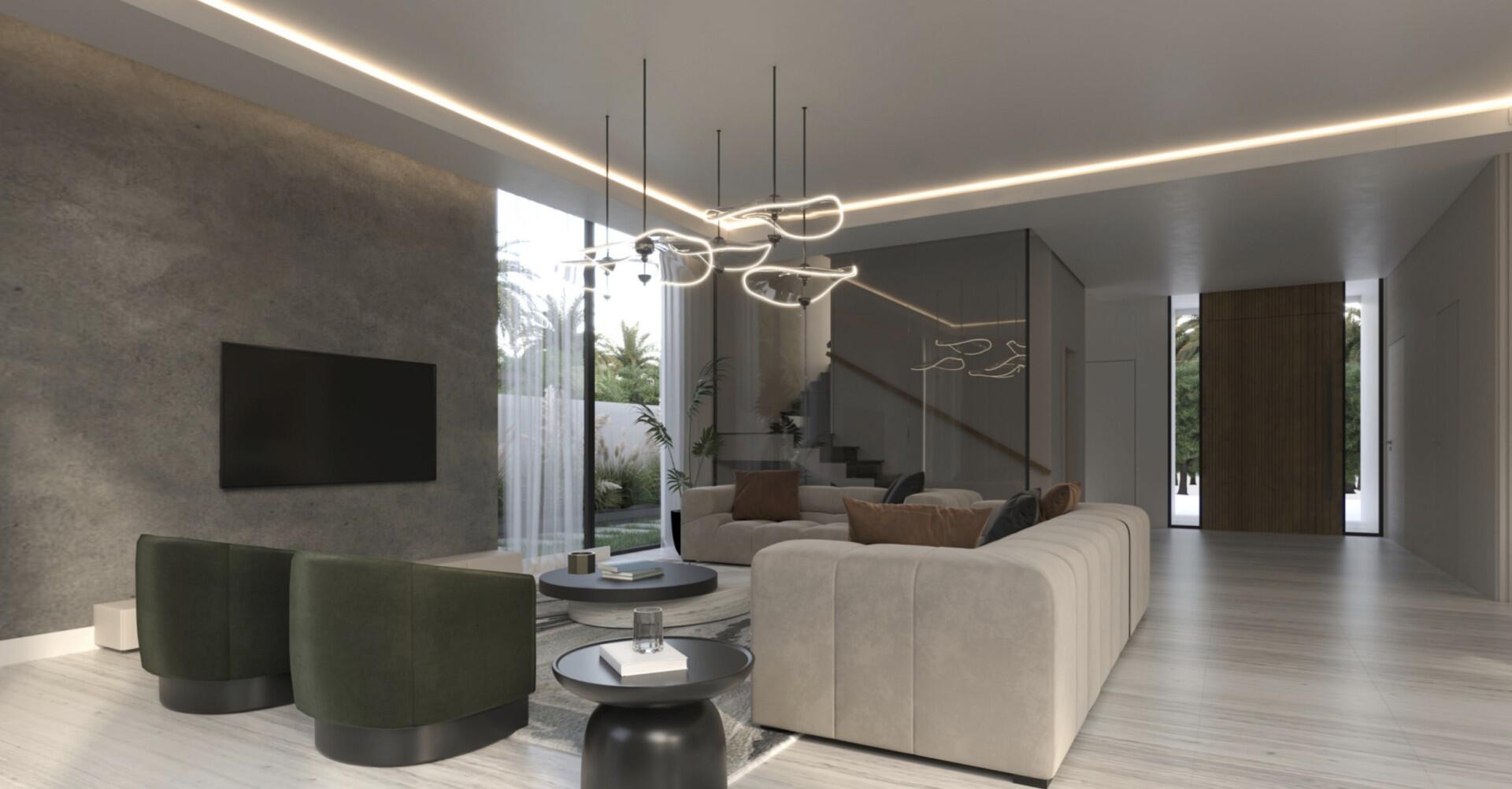 The design philosophy of TERRA is characterized by clean lines and geometric precision. The villas exhibit a bold interplay of rectangles and squares, creating a visually captivating aesthetic that complements the organic beauty of the golf course. This geometric language defines the exterior silhouette and seamlessly extends into the interior spaces, instilling a sense of clarity and purpose throughout.